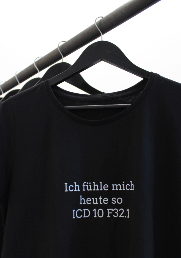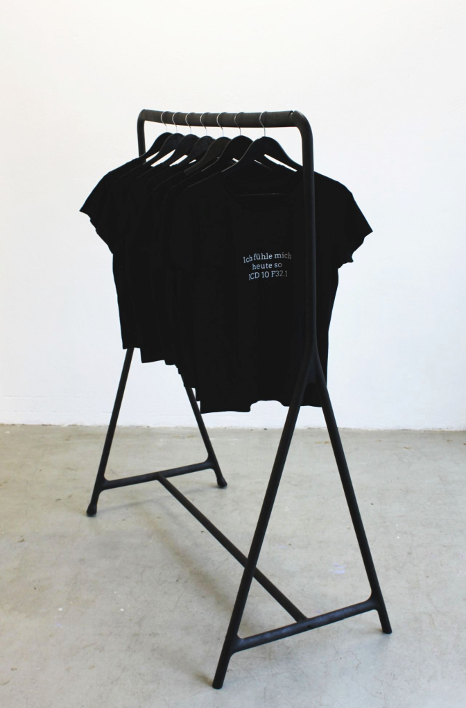 Die Arbeit besteht aus sieben schwarzen T-Shirts, die den Slogan „Ich fühle mich heute so ICD 10 F32.1“ tragen, den Schlüssel für eine „Mittelgradige depressive Episode“ des Klassifizierungssystems von Krankheiten, das die World Health Organization 1948 mit der ersten Version ICD 1 (International List of Causes of Death) ins Leben rief, und das mittlerweile in seiner zehnten Variante in über hundert Ländern, darunter Deutschland, als Standarddiagnoseverfahren im Gesundheitssystem seine Anwendung findet.
